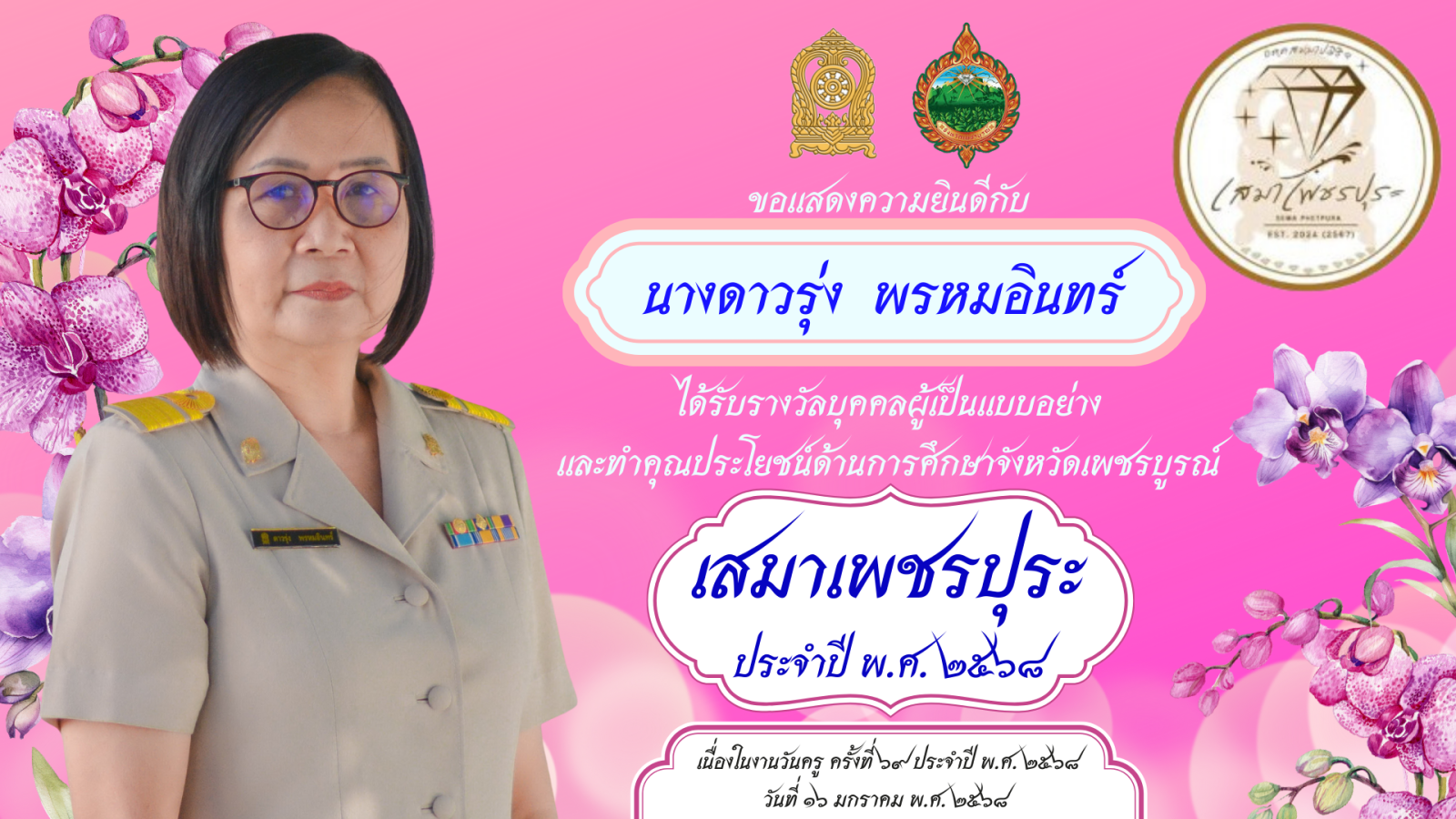 นางดาวรุ่ง พรหมอินทร์ ได้รับรางวัลบุคคลผู้เป็นแบบอย่างและทำคุณประโยชน์ด้านการศึกษาจังหวัดเพชรบูรณ์ เสมาเพชรปุระ ประจำปี พ.ศ. 2568