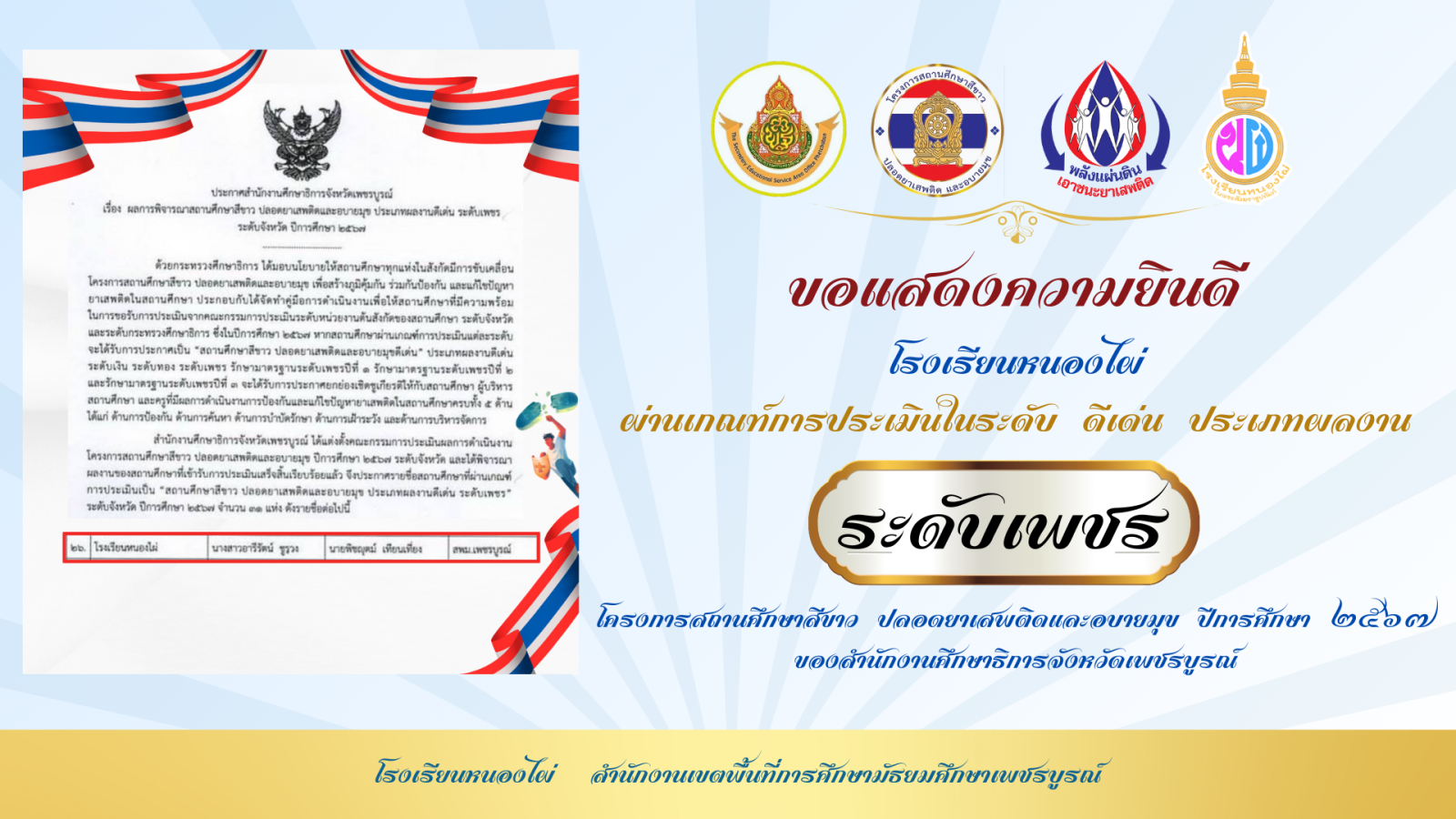 โรงเรียนหนองไผ่ได้รับรางวัลสถานศึกษาสีขาวปลอดยาเสพติดและอบายมุข ระดับดีเด่น ประเภทผลงาน ระดับเพชร