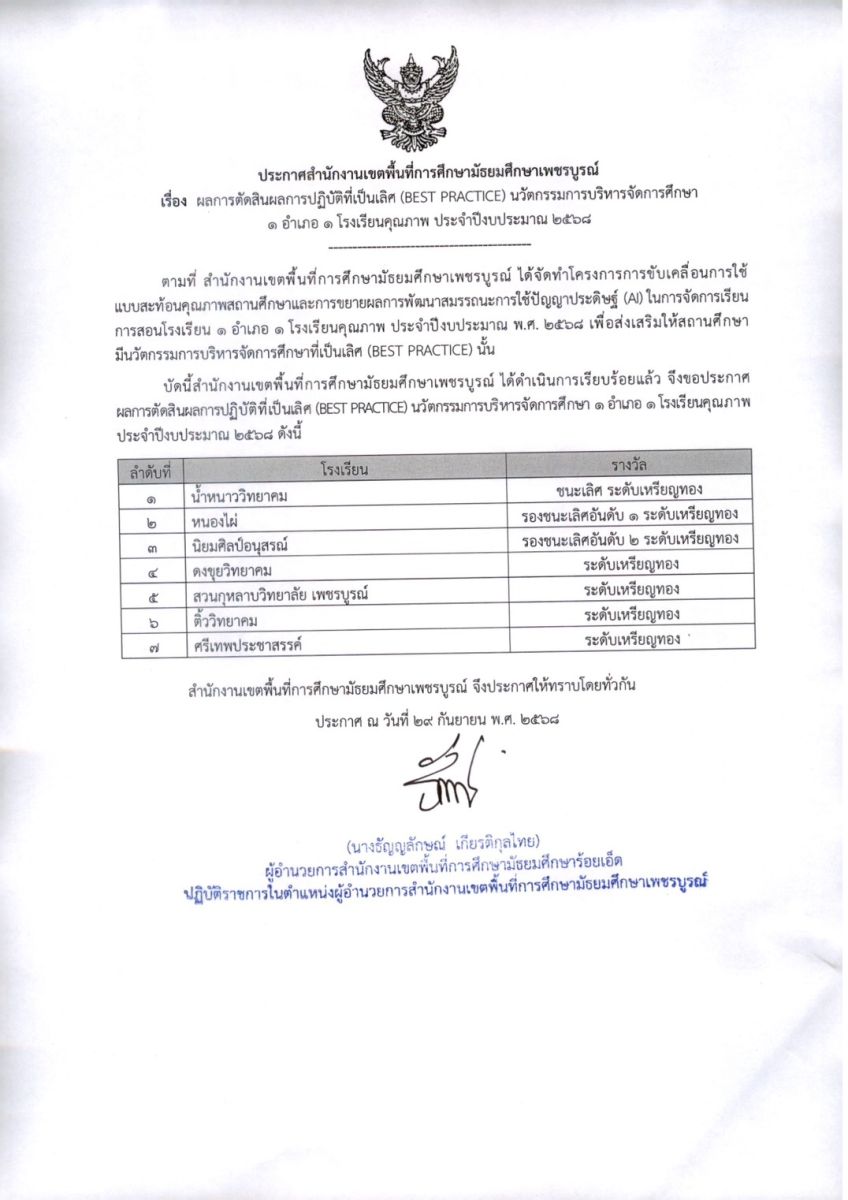 โรงเรียนหนองไผ่ขอขอบพระคุณสำนักงานเขตพื้นที่การศึกษามัธยมศึกษาเพชรบูรณ์ ที่ได้ประกาศผลการคัดสรรผลงานปฏิบัติที่เป็นเลิศ (Best Practice) ด้านนวัตกรรมการบริหารจัดการศึกษา “1 อำเภอ 1 โรงเรียนคุณภาพ” ประจำปีงบประมาณ พ.ศ. 2568