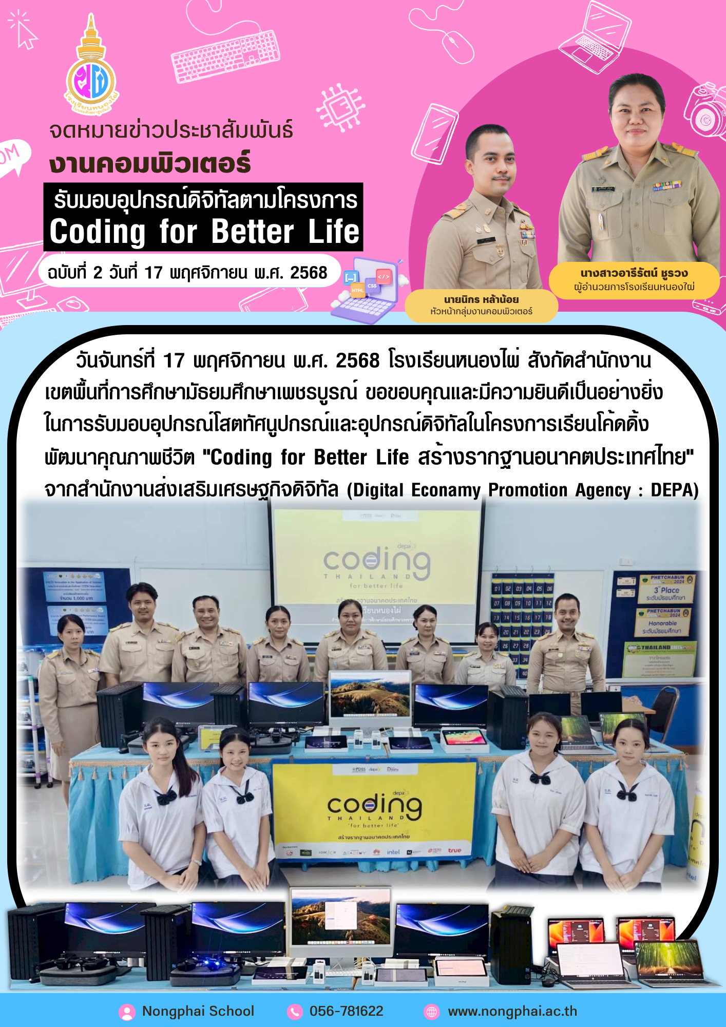 วันจันทร์ที่ 17 พฤศจิกายน 2568 โรงเรียนหนองไผ่ได้รับมอบอุปกรณ์โสตทัศนูปกรณ์และอุปกรณ์ดิจิทัลตามโครงการ Codeing for Better Life จาก DEPA
