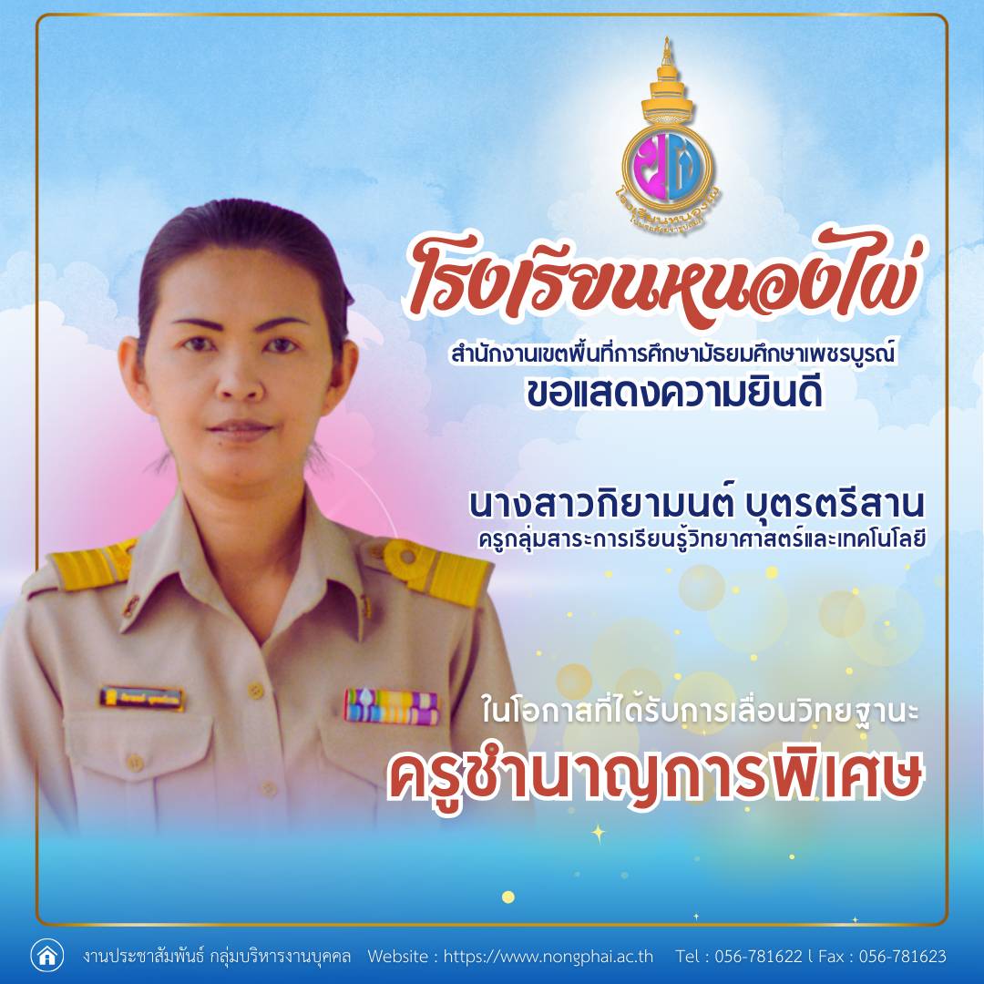 โรงเรียนหนองไผ่ สพม.เพชรบูรณ์ ขอแสดงความยินดีกับนางสาวกิยามนต์ บุตรตรีสาน ครูกลุ่มสาระการเรียนรู้วิทยาศาสตร์และเทคโนโลยี ในโอกาสที่ได้รับการเลื่อนวิทยฐานะ ครูชำนาญการพิเศษ