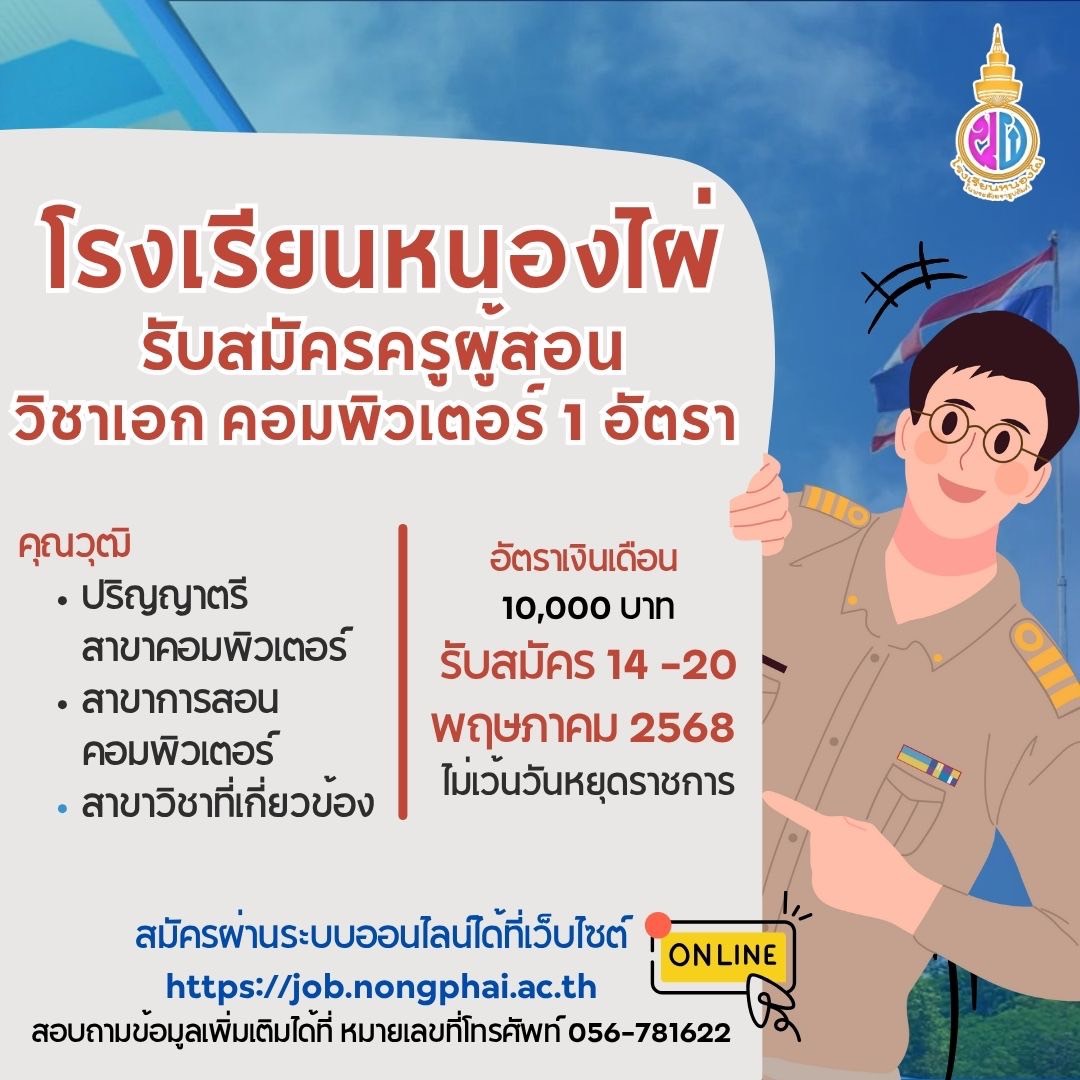 ประกาศโรงเรียนหนองไผ่ เรื่อง รับสมัครบุคคลเพื่อคัดเลือกเป็นลูกจ้างชั่วคราว ตำแหน่ง ครูผู้สอน วิชาคอมพิวเตอร์