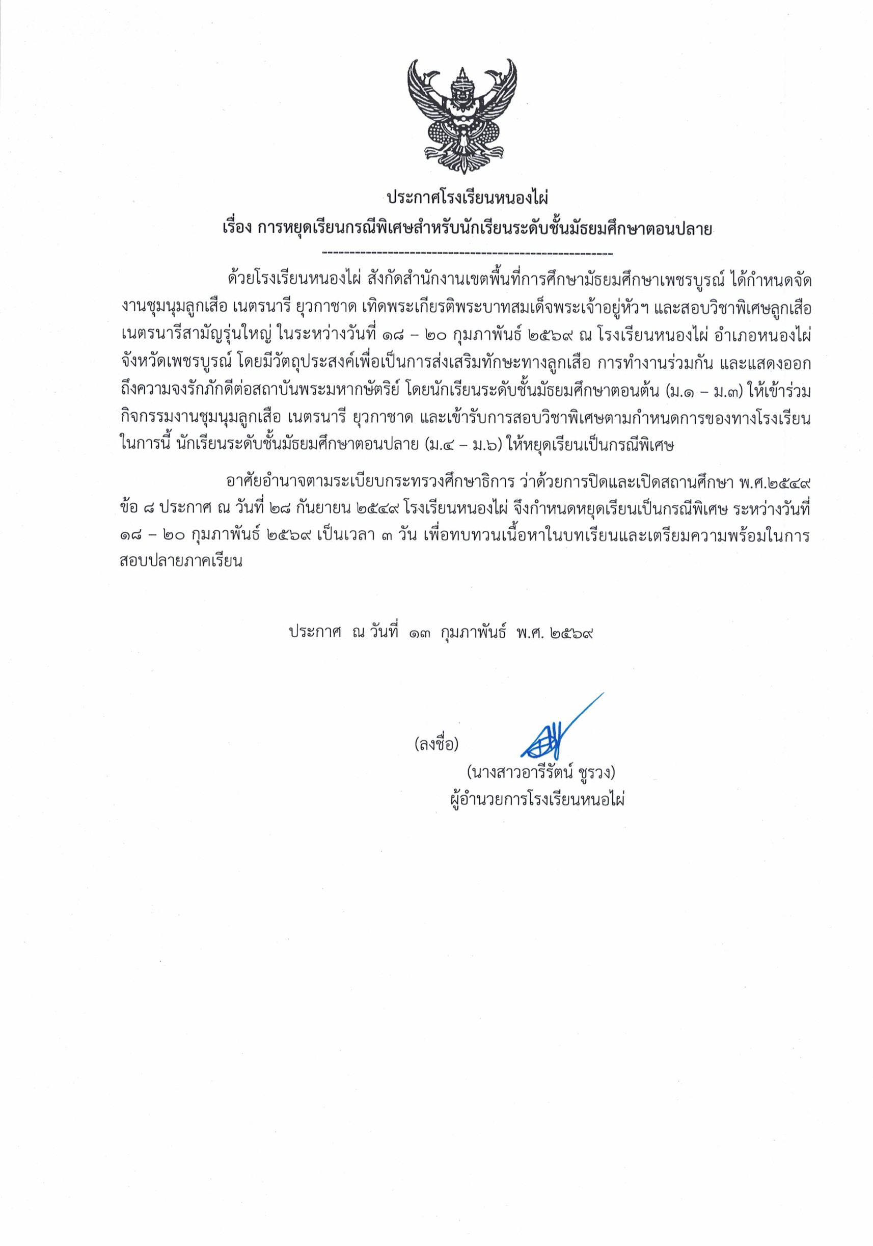ประกาศโรงเรียนหนองไผ่ เรื่อง การหยุดเรียนกรณีพิเศษสำหรับนักเรียนชั้นมัธยมศึกษาตอนปลาย