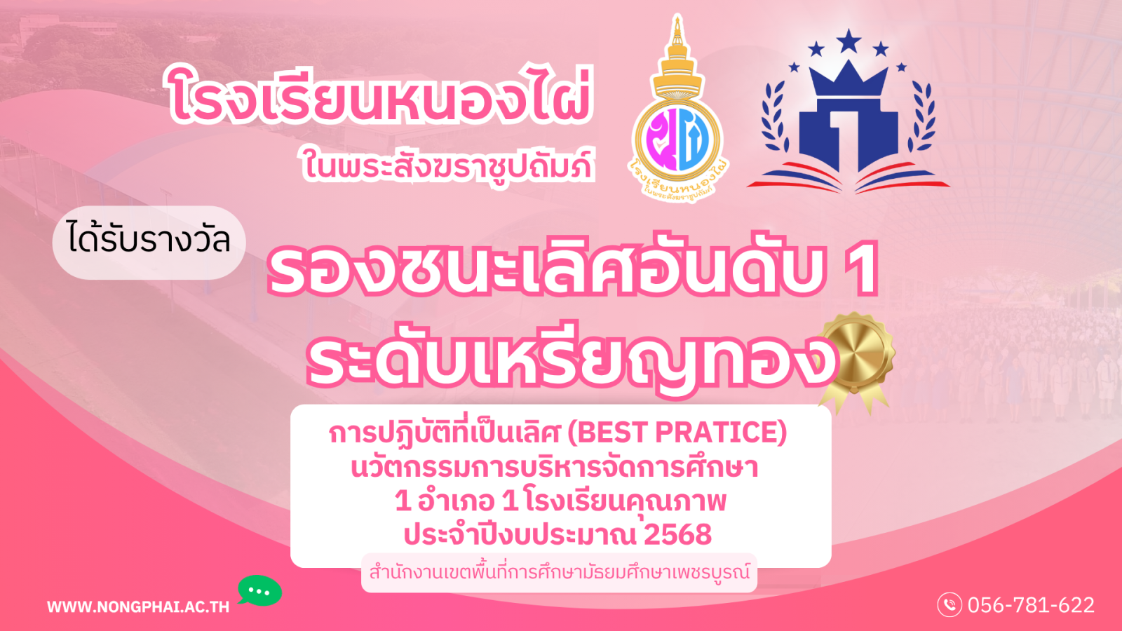 โรงเรียนหนองไผ่ขอขอบพระคุณสำนักงานเขตพื้นที่การศึกษามัธยมศึกษาเพชรบูรณ์ ที่ได้ประกาศผลการคัดสรรผลงานปฏิบัติที่เป็นเลิศ (Best Practice) ด้านนวัตกรรมการบริหารจัดการศึกษา “1 อำเภอ 1 โรงเรียนคุณภาพ” ประจำปีงบประมาณ พ.ศ. 2568