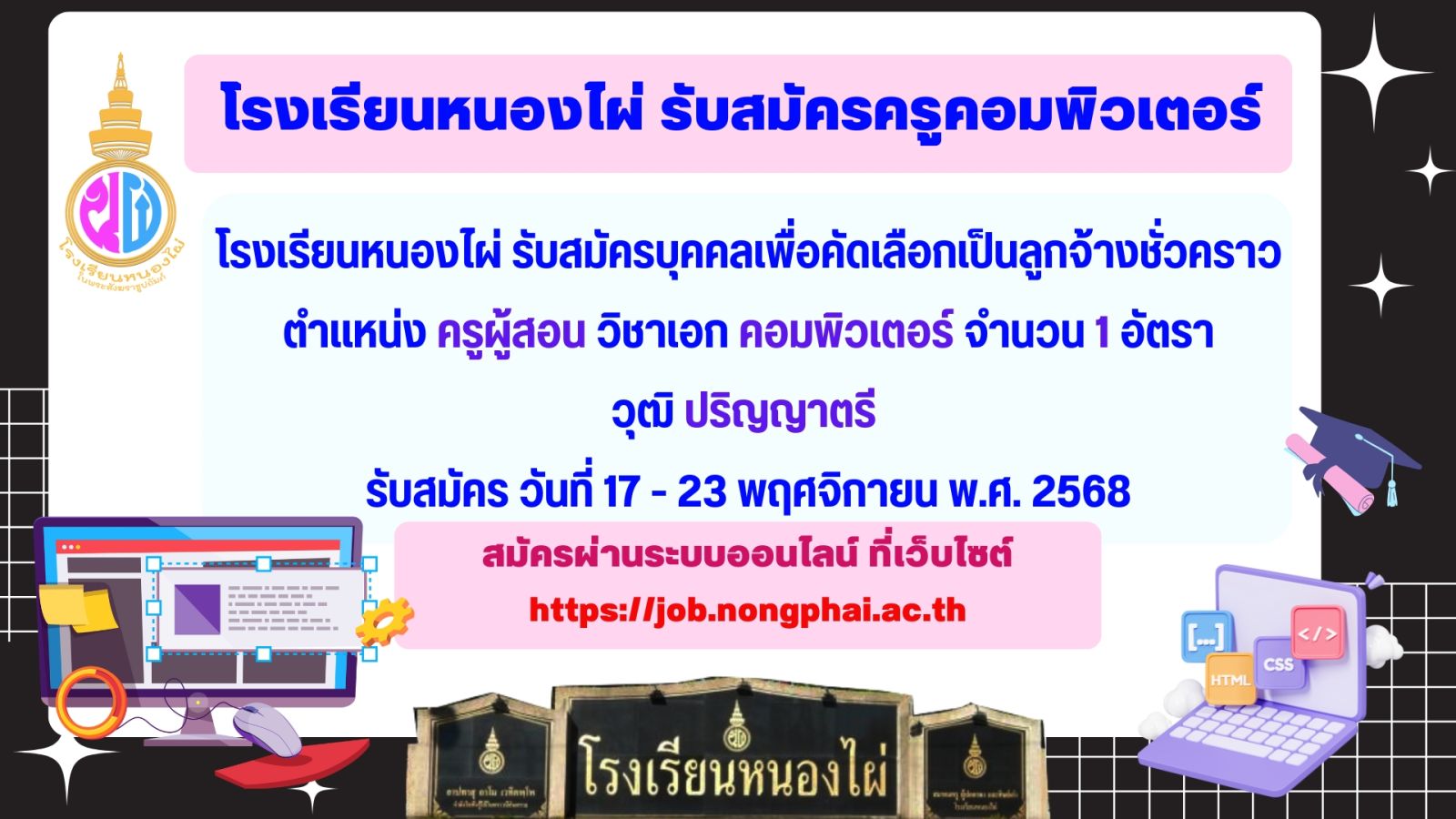 [2025-11-01] ประกาศโรงเรียนหนองไผ่ เรื่อง รับสมัครบุคคลเพื่อคัดเลือกเป็นลูกจ้างชั่วคราว ตำแหน่ง ครูผู้สอน วิชาคอมพิวเตอร์ View : 171
