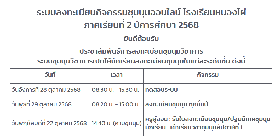 [2025-10-01] ประกาศโรงเรียนหนองไผ่ เรื่อง การรับนักเรียนระหว่างปีการศึกษา ภาคเรียนที่ 2 ปีการศึกษา 2568 View : 133