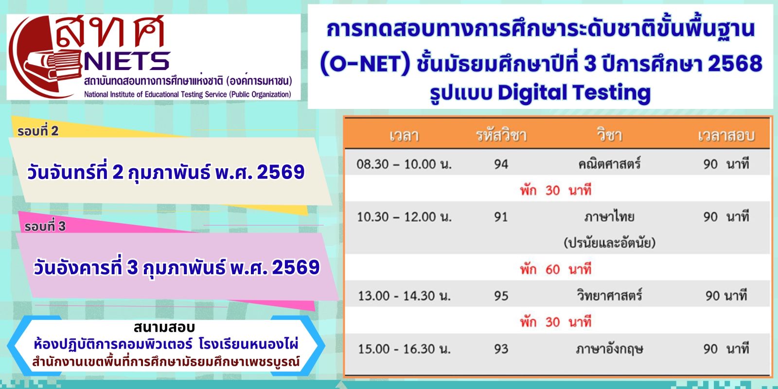 [2026-01-06] คำสั่งโรงเรียนหนองไผ่ ที่ 856/2568 เรื่อง แต่งตั้งคณะกรรมการดำเนินโครงการส่งเสริมและพัฒนาศักยภาพผู้เรียนทางด้านวิทยาศาสตร์และเทคโนโลยีดิจดทัล ภาคเรียนที่ 2 ปีการศึกษา 2568 View : 68