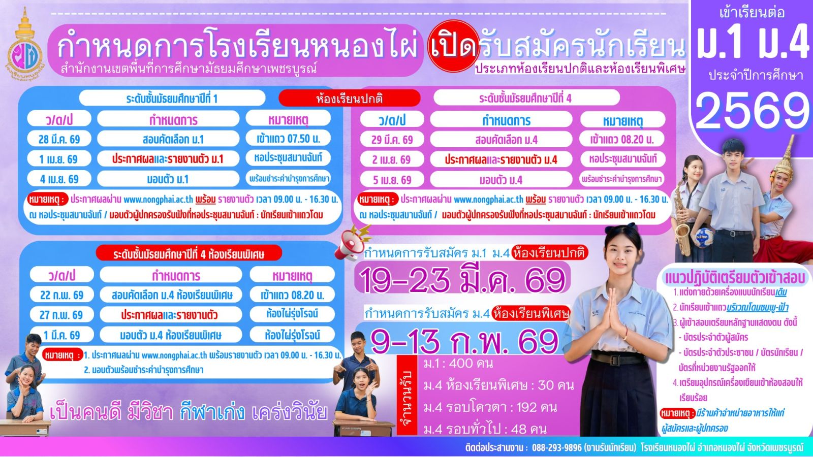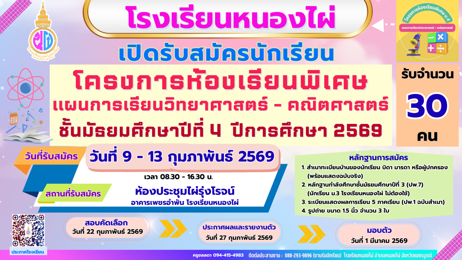 [2026-01-26] ประกาศโรงเรียนหนองไผ่ เรื่อง การรับนักเรียนเข้าเรียนชั้นมัธยมศึกษาปีที่ 1 และชั้นมัธยมศึกษาปีที่ 4 ปีการศึกษา 2569 View : 675