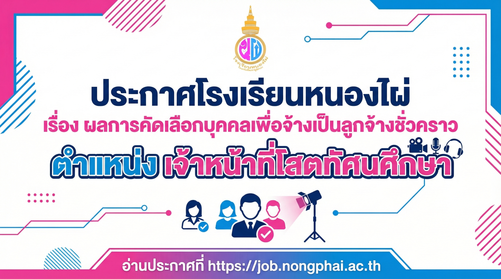 [2025-12-09] ประกาศโรงเรียนหนองไผ่ เรื่อง รับสมัครบุคคลเพื่อคัดเลือกเป็นลูกจ้างชั่วคราว ตำแหน่ง เจ้าหน้าที่โสตทัศนศึกษา View : 55