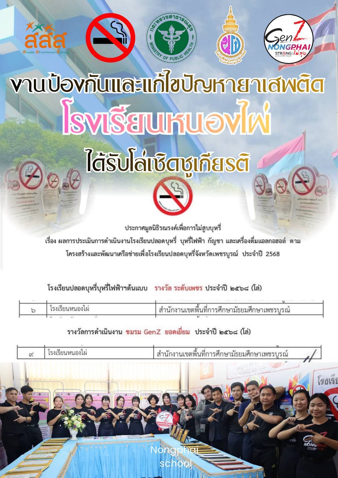 งานป้องกันและแก้ไขปัญหายาเสพติด โรงเรียนหนองไผ่ ได้รับโล่เชิดชูเกียรติ โรงเรียนปลอดบุหรี่ บุหรี่ไฟฟ้าฯ ต้นแบบ ระดับเพชร