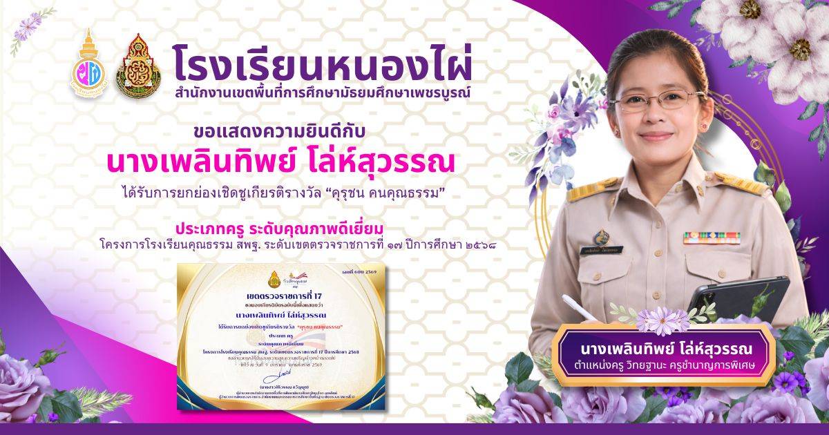 นางเพลินทิพย์ โล่ห์สุวรรณ ได้รับรางวัล คุรุชน คนคุณธรรม