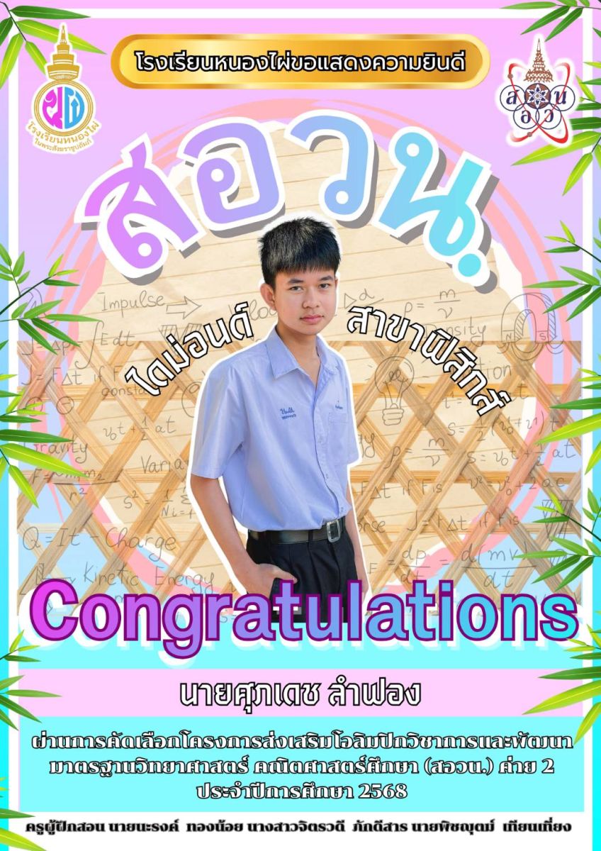 นายศุภเดช ลำฟอง นักเรียนชั้น ม.5/2 ผ่านการคัดเลือกโครงการส่งเสริมโอลิมปิกวิชาการและพัฒนามาตรฐานวิทยาศาสตร์ คณิตศาสตร์ศึกษา (สอวน.) ค่าย 2 ประจำปีการศึกษา 2568